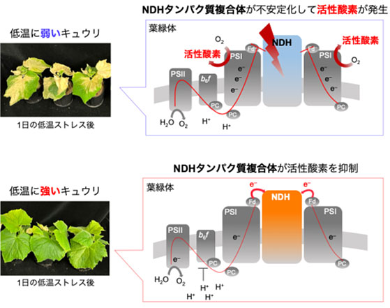 低温ストレスは、キュウリなどの夏作物において光合成を著しく阻害し、生育不良を引き起こします。特にキュウリでは、葉緑体の光化学系 I(PSI)が低温下で感受性を示すことが報告されていますが、詳細な分子メカニズムは未だ明らかではありませんでした。本発表では、低温で PSI 光阻害が起こる要因として、NDH複合体の分解が関与していることを明らかにしましたので報告致します。